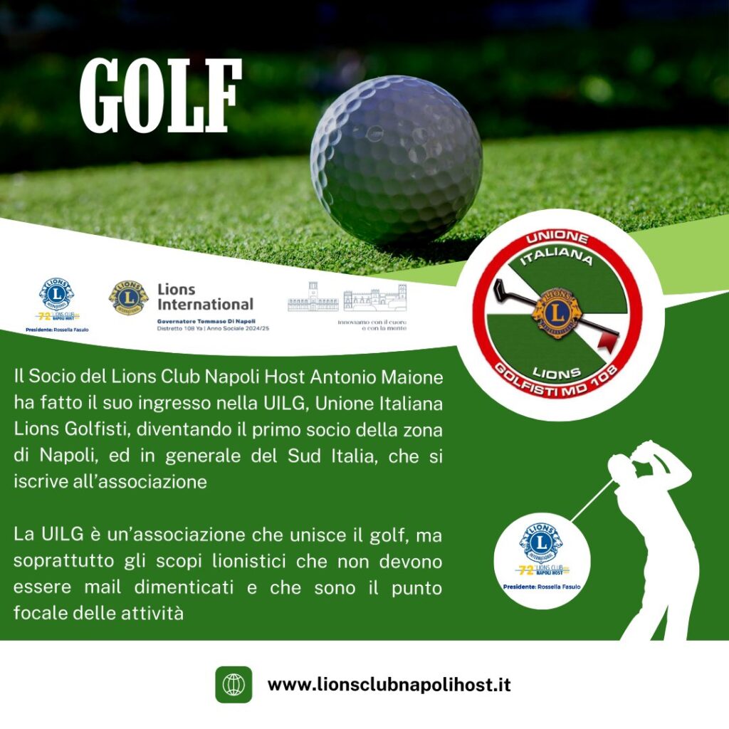 Il Socio del Lions Club Napoli Host Antonio Maione ha fatto il suo ingresso nella UILG, Unione Italiana Lions Golfisti, diventando il primo socio della zona di Napoli, ed in generale del Sud Italia, che si iscrive allโassociazione